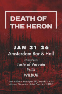 The world is dark, unrelenting and will test you at your lowest moments. So, step into Unknown and experience music never before heard from Death of the Heron. With special guests Taste of Vervain, Ysilik and WILBUR.