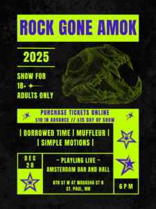 Rock Gone Amok, split ticket showcase of raw local talent from St. Cloud. Playing a live mix of covers you’ve longed for with original music to fulfill that heart shaped hole for indie rock sleaze. This line up you won’t wanna miss, almost like chicken soup for the punk soul.
