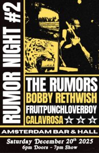 Rumor Night Episode 2, kicks off with a genre-blending night of music, headlined by R&B-Pop-Rock group The Rumors. Minneapolis local favorites bobbyrethwish, fruitpunchloverboy and Calavrosa bring their unique sounds to the stage as supporting acts. Expect a dynamic mix of R&B, Pop, Rock, Alternative, Shoegaze, Country, and Experimental music all night.