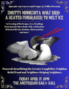 On April 17, at the Amsterdam Bar & Hall, Queenie von Curves and Tropes & Trifles will be hosting a “Smutty Minnesota Wolf Bird: A Heated Fundraiser to Melt ICE.” It’s going to be an all-out evening of smutty readings, burlesque babes and Heated Rivalry-inspired fandom, with all proceeds split equally and donated to the Greater Longfellow Neighbor Relief Fund and Neighbors Helping Neighbors.